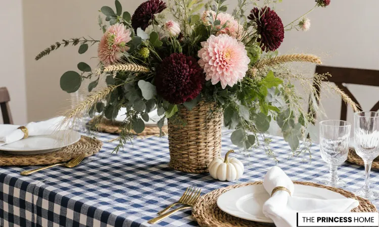 This chic fall table blends rustic charm with modern elegance through a floral arrangement of blush pink and deep burgundy dahlias, eucalyptus, and wheat. Displayed in a woven basket vase atop a navy and white gingham tablecloth, it strikes a perfect balance of cozy and contemporary. Finished with rattan placemats, gold flatware, and mini white pumpkins, it’s an inviting choice for a stylish harvest dinner party.