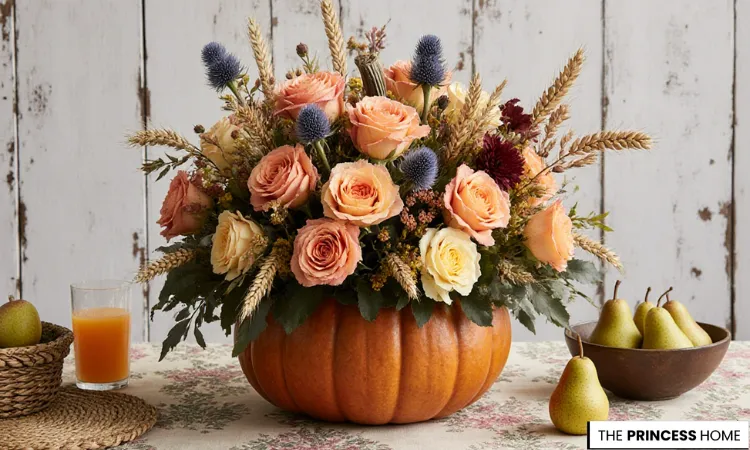 This stunning fall floral centerpiece captures the beauty of the season in a hollowed-out orange pumpkin. The soft blush and peach roses blend beautifully with creamy yellow blooms and blue thistle, creating a cozy harvest vibe. Perfect for Thanksgiving or a fall brunch, it adds rustic elegance and natural charm to any table setting.