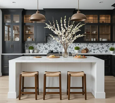 “Style your shelves and countertops with potted plants of different sizes and shapes to add vibrant greenery and organic life to your kitchen. A few potted herbs, a vase of fresh flowers, or a small windowsill herb garden bring color, charm, and everyday practicality.”