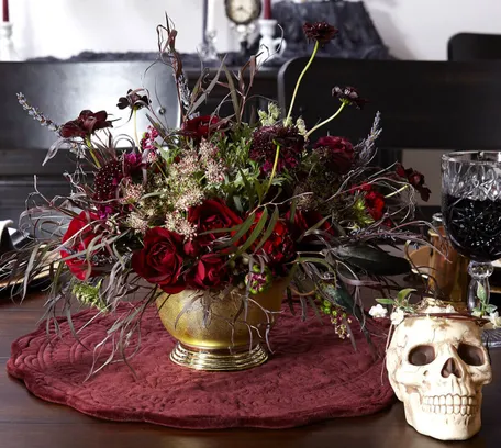 Welcome guests with a Halloween wreath that’s more wicked than traditional. Create one using black twigs, faux black roses, and skulls or ravens. You can also intertwine orange and purple ribbon for a pop of Halloween color, or add LED lights to make the wreath glow at night.