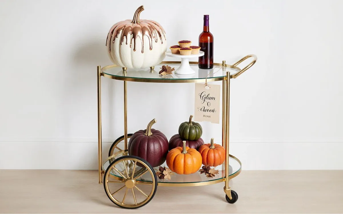 This stylish gold-framed bar cart is designed for a chic “Glam O’ Ween” celebration, blending elegance with festive flair. On the top shelf, a large white pumpkin with a metallic rose gold drip takes center stage beside a Celebration Drink bottle and a small platter of treats. The bottom shelf features a rich mix of decorative gourds in burgundy, emerald green, and classic orange, adding depth and seasonal color. Together, these details create a glamorous, modern setup that’s perfect for sophisticated fall entertaining.