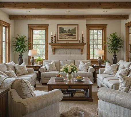 Arrange furniture in cozy conversational groupings to facilitate intimacy and connection in your farmhouse interior. Position sofas and armchairs facing each other to encourage conversation and interaction, and place a coffee table or ottoman in the center to anchor the arrangement. Create a relaxed and inviting atmosphere where family and friends can gather and unwind together.