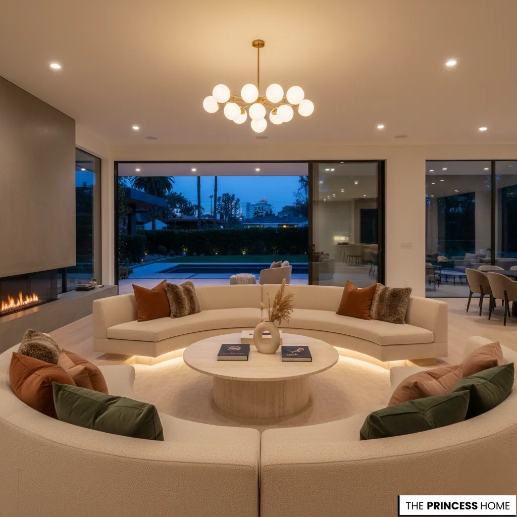 Incorporating plush textures, layered fabrics, and subtle lighting enhances comfort and intimacy. Beyond aesthetics, this layout improves acoustics and sightlines, making conversations effortless. Minimalist décor paired with curved furniture maintains openness while adding warmth. This trend highlights human connection as the heart of interior design, blending style with social function.