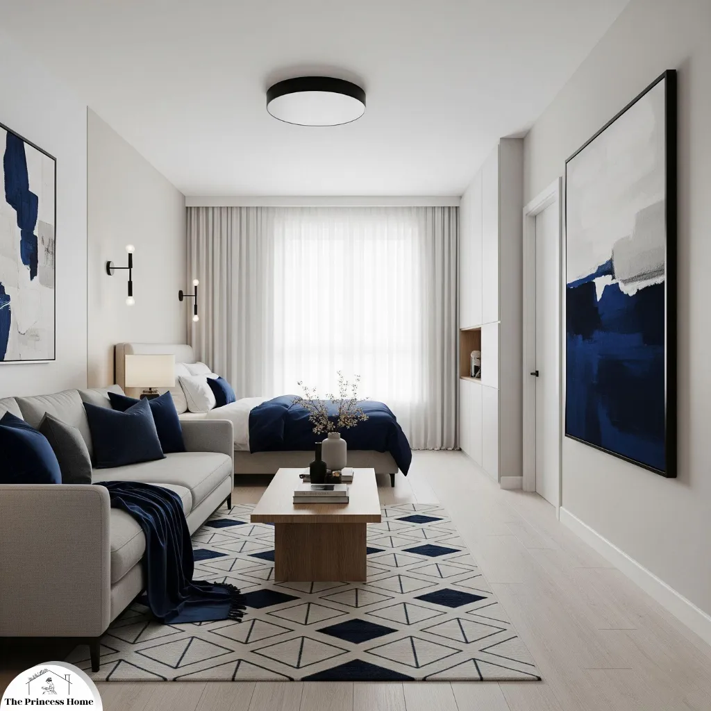 Colors play a major role in how a small studio apartment feels. Light shades such as white, beige, and soft gray help create the illusion of a larger and brighter space, making the apartment feel airy and open. To add personality, you can introduce accent colors like navy blue, emerald green, or even black through rugs, cushions, or artwork. For the best results, stick to a cohesive color palette that maintains harmony and prevents visual clutter, ensuring your studio looks stylish and well-organized.