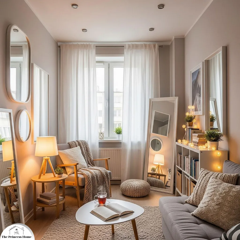 Use light colors, mirrors, and compact furniture with multiple uses.