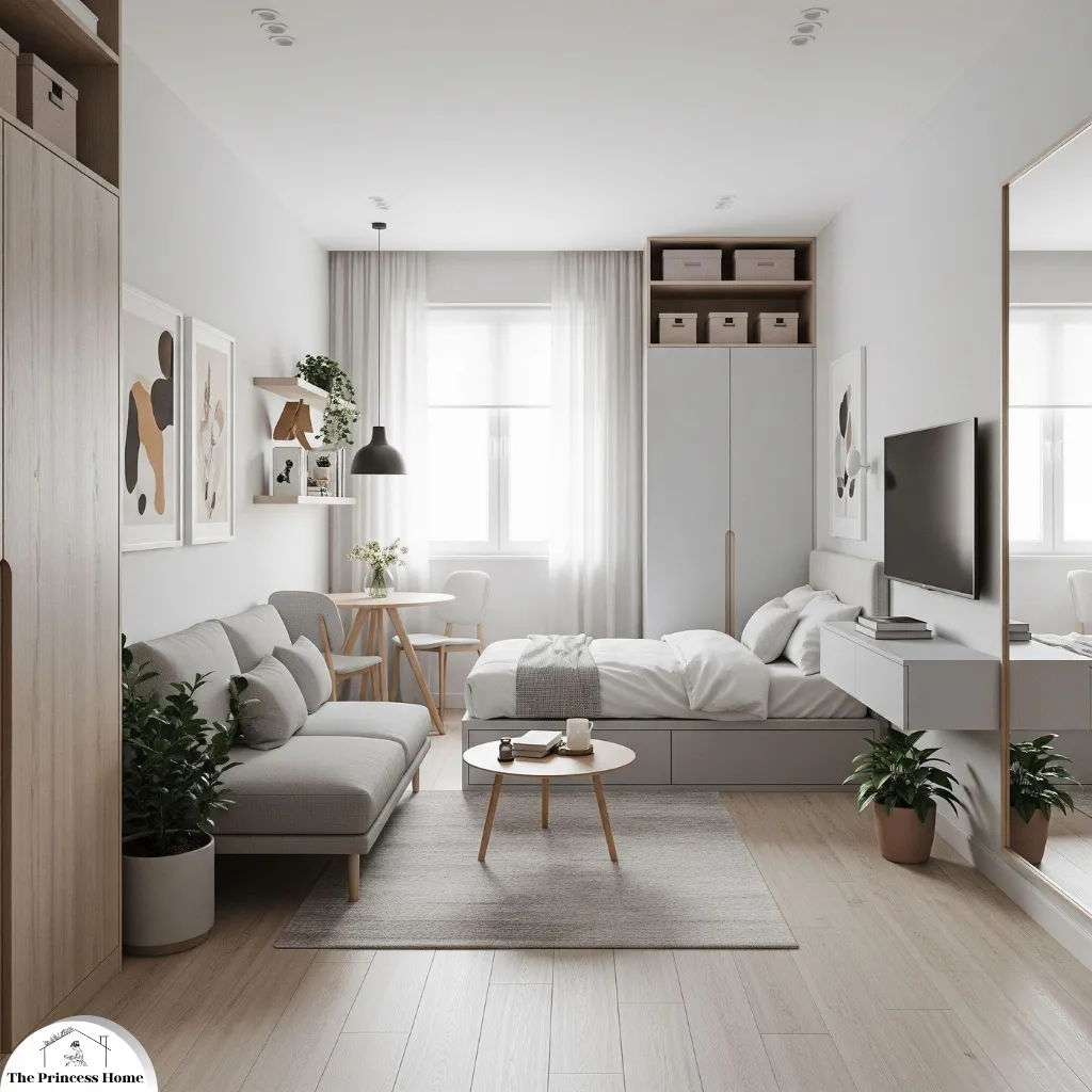 To make a studio apartment feel more spacious, a few simple design tricks can go a long way. Large mirrors are one of the most effective solutions, as they reflect light and visually double the sense of space. Choosing furniture with raised legs also creates openness by allowing light and air to flow underneath. Finally, sticking to a minimalist approach helps avoid overcrowding, ensuring your studio remains uncluttered, functional, and visually appealing.