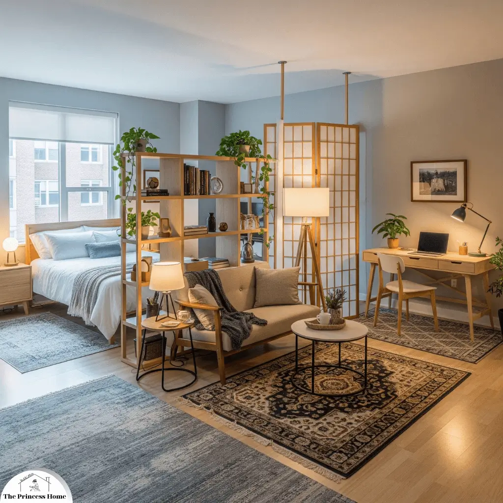 Bookshelves, curtains, folding screens, or even area rugs can divide zones effectively.