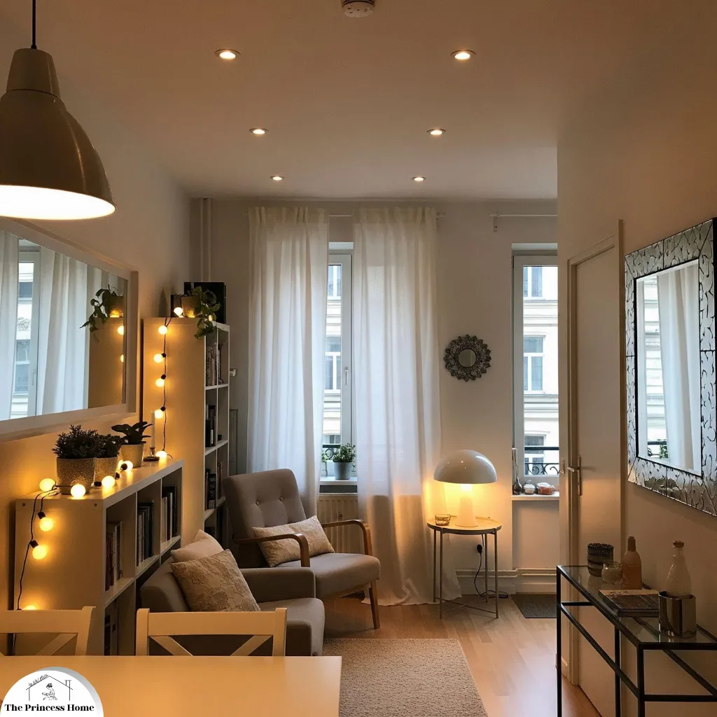 Lighting is essential in any studio apartment, as it greatly affects how spacious and inviting the space feels. To maximize natural light, avoid heavy curtains and opt for sheer or light fabrics that let sunlight flow in freely. Layered lighting is also key—combine ceiling lights, wall sconces, and table lamps to create a warm and flexible atmosphere. For an added trick to visually enlarge the room, place a large mirror opposite the window to reflect natural light and make the apartment feel brighter and more open.