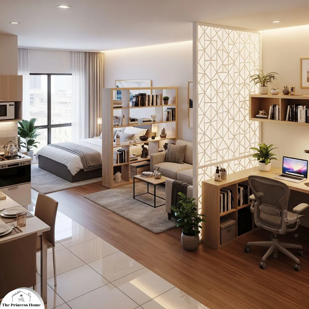 Even though a studio apartment is an open space, you can still define separate areas with smart design choices. Room dividers such as lightweight screens, folding panels, or open bookshelves help create privacy without closing off the room. Area rugs are another effective way to visually separate zones, whether under the bed, sofa, or dining table. To maximize functionality, opt for multipurpose furniture like a sofa bed or a foldable dining table, which saves space while adding versatility to your studio layout.