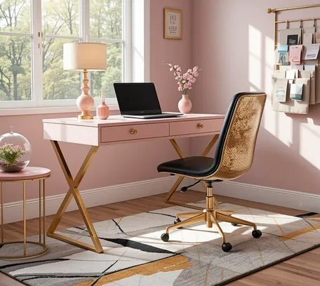 To create a chic home office, focus on stylish details like golden trim, pink and gold tassels, and gilded hardware. Add personality with hot pink or gold accessories, such as desk items, floral accents, and lamps. Statement wall art or bold furniture pieces in these hues can elevate the space, while pillows, throws, or rugs offer a softer touch if you’re not ready for a full commitment. Gold lighting fixtures add a final glamorous touch.