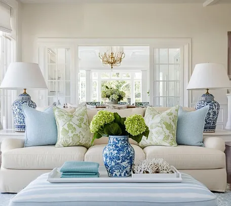 This elegant living room exudes coastal-inspired decor, centered around a white sofa adorned with blue and green throw pillows. Prominent blue and white chinoiserie ginger jar lamps and a patterned vase with hydrangeas add sophisticated accents. A striped ottoman with a white tray holds further decorative elements, completing this serene and inviting Hamptons style interior.
