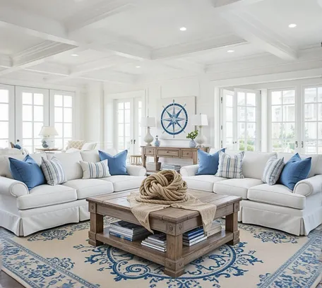 This sophisticated living room perfectly blends coastal elegance with traditional Hamptons style. Two plush white sofas, dressed with an assortment of blue and white throw pillows, create a symmetrical and inviting seating arrangement. A prominent wooden coffee table holds a large coiled rope centerpiece, reinforcing the nautical theme. The space is anchored by a beautiful blue and beige patterned rug, while a striking compass wall art above a console table adds to the maritime-inspired decor, all bathed in abundant natural light from numerous windows.