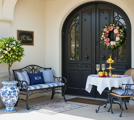 This charming porch exudes a welcoming ambiance with its elegant black wrought iron double doors adorned with a vibrant floral wreath. A matching wrought iron bench with blue and white striped cushions and a personalized pillow invites relaxation next to a decorative blue and white ceramic pot holding a small citrus tree. Across from the bench, a bistro set with a round table draped in a white cloth displays a tiered fruit stand, and plates, suggesting an intimate outdoor setting. The scene is further enhanced by a patterned rug that ties the seating area together, all set against a light-colored facade. A small, framed sign adds a personal touch to this stylish outdoor space.