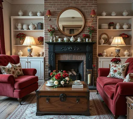 This cozy living room exudes a warm and inviting ambiance with its rich red sofas flanking a rustic wooden chest that serves as a coffee table. A classic fireplace with a dark mantel and brick surround anchors the room, above which hangs a round mirror reflecting the symmetrical arrangement of built-in white shelves displaying an array of decorative ceramics and books. Soft lighting from table lamps on either side of the fireplace casts a gentle glow, highlighting the patterned rug that ties the seating area together. Touches of floral arrangements on the coffee table and mantelpiece add a fresh and vibrant element to the traditional decor.