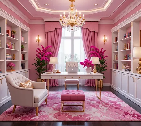 This vibrant home office is a luxurious blend of pink and white, beginning with soft pink walls and substantial white built-in bookcases filled with books and golden accents. At the center of the room, a large window framed by plush pink drapes lets in ample natural light, further enhancing the bright and welcoming atmosphere. In front of the window, a white desk with gold legs is paired with a white office chair and a pink ottoman, while a crystal chandelier illuminates the space. The room is anchored by a pink and white abstract rug, creating an opulent and feminine sanctuary.