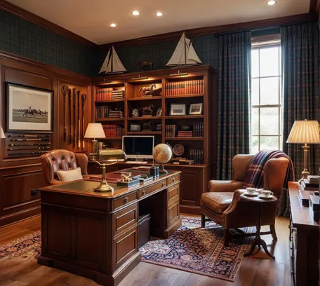 A Ralph Lauren home office combines traditional design with modern functionality, drawing inspiration from English country estates, American prep-school style, and equestrian or nautical themes. This look creates a sophisticated, vintage-inspired workspace with layered textures and timeless character—perfect for both classic libraries and modern office nooks.