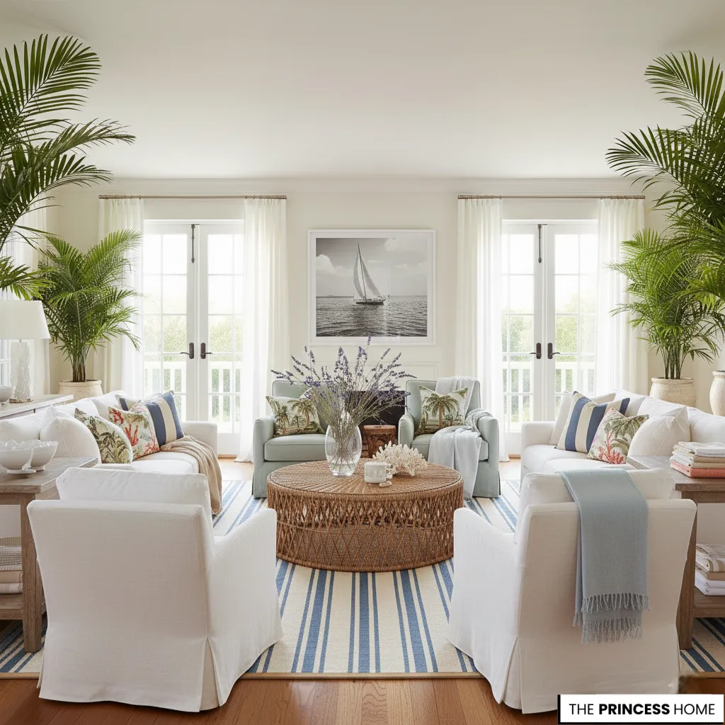 Start with neutral bases like whites, creams, and beige. Add seasonal accents such as linen throws, patterned cushions, fresh flowers, and natural textures like wicker, rattan, and seagrass rugs.