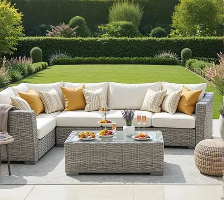 Create a cozy and functional outdoor seating area to fully enjoy the warm weather and sunshine. Invest in plush, weather-resistant sofas, lounge chairs, or hammocks that invite you to relax with a cool drink in hand. Layer in coordinating cushions and soft throws for added comfort and style. Define the space with outdoor rugs and side tables for convenience, while accent pillows, potted greenery, and hanging baskets add charm and personality. For comfort and practicality, include shade solutions like umbrellas or pergolas, and extend your enjoyment into the evening with ambient lighting such as string lights or lanterns.
