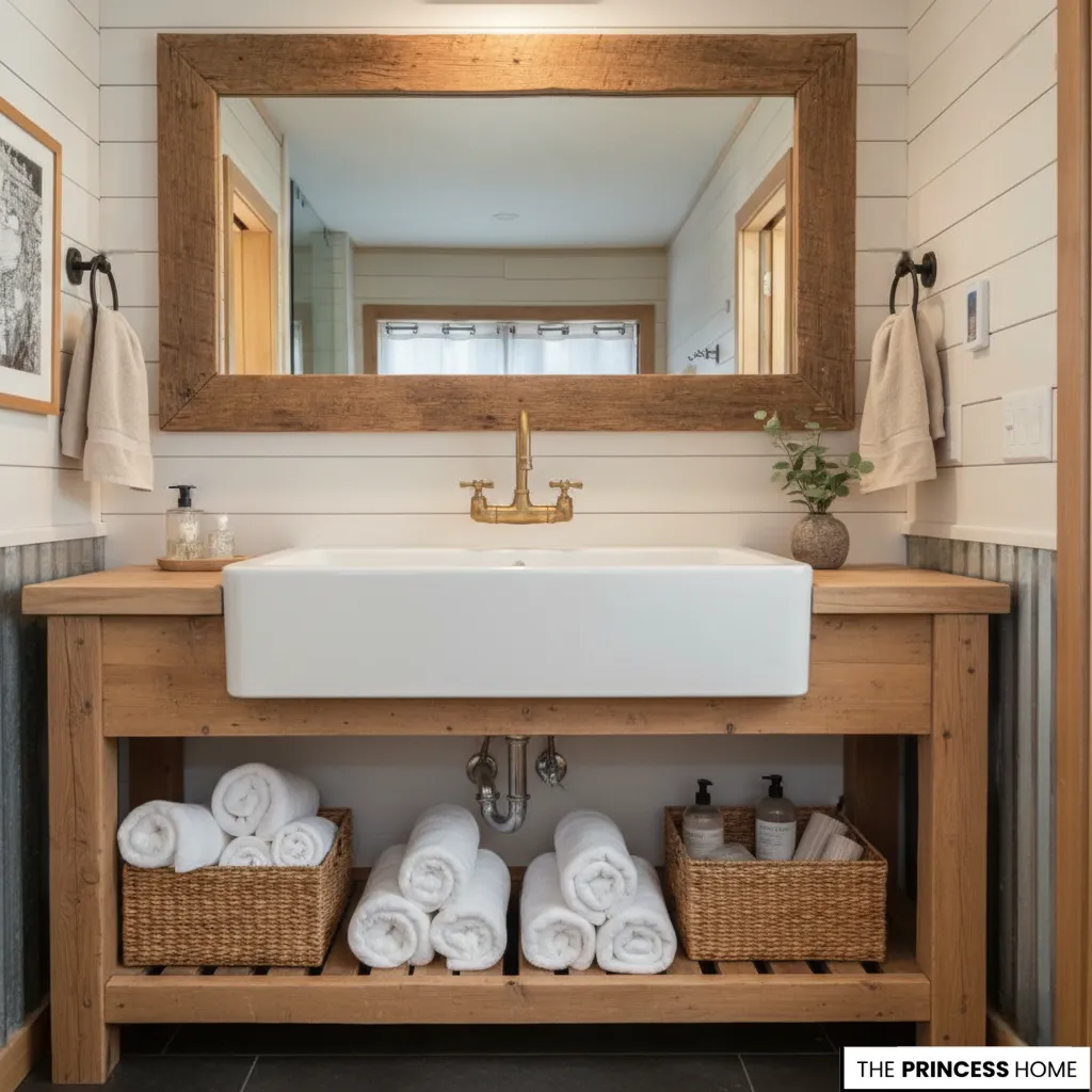 Showcase towels and bath essentials neatly to create a lived-in, welcoming atmosphere. This image showcases a farmhouse-style bathroom with a warm natural wood vanity and clean shiplap walls. A large framed mirror and a unique stone vessel sink create strong focal points, enhanced by industrial caged sconces. The open vanity shelf adds practical storage for folded towels while maintaining a relaxed, welcoming look.