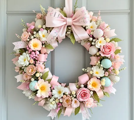 Lay out materials. Trim stems. Attach faux greenery evenly to the wreath base with wire or tape. Secure larger flowers like peonies and hydrangeas, then fill gaps with smaller blooms like tulips and daisies. Adjust for balance and trim excess. Display on a door or as a centerpiece to welcome spring.