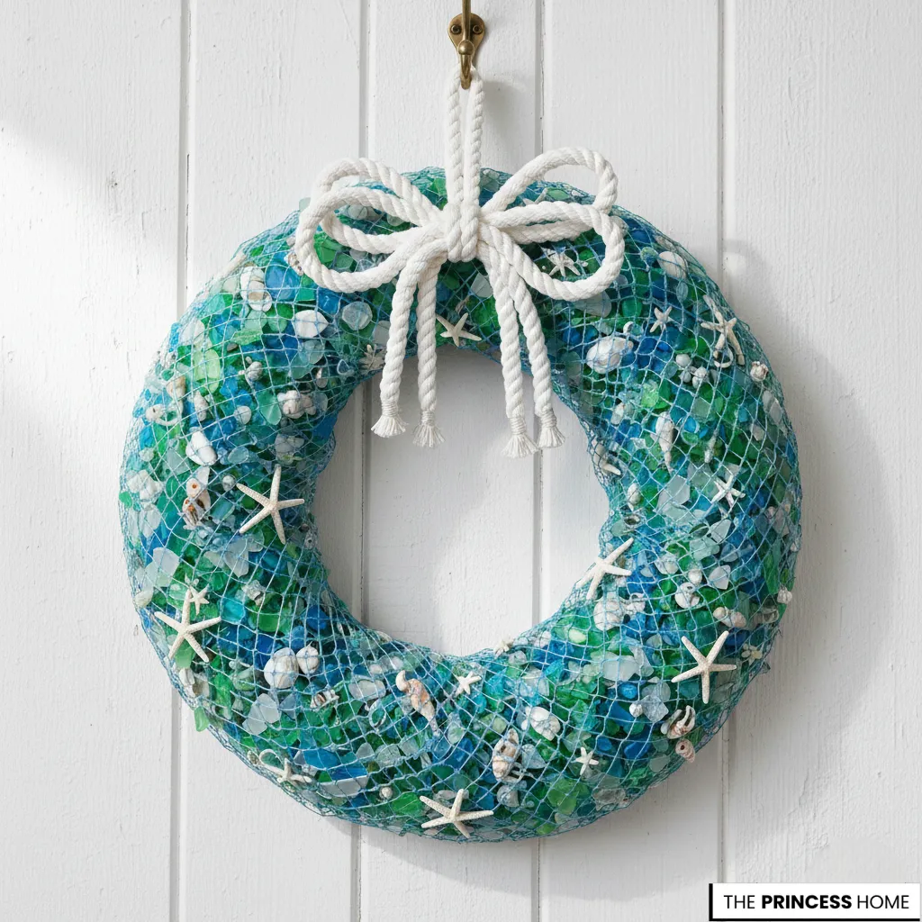 This sea glass and fishing net wreath adds bright blue and green coastal charm. Blue, green, and clear sea glass is layered with small shells and mini starfish for texture. Wrapped in aqua fishing net and finished with a white rope bow, this DIY wreath brings serene seaside style to any entryway.