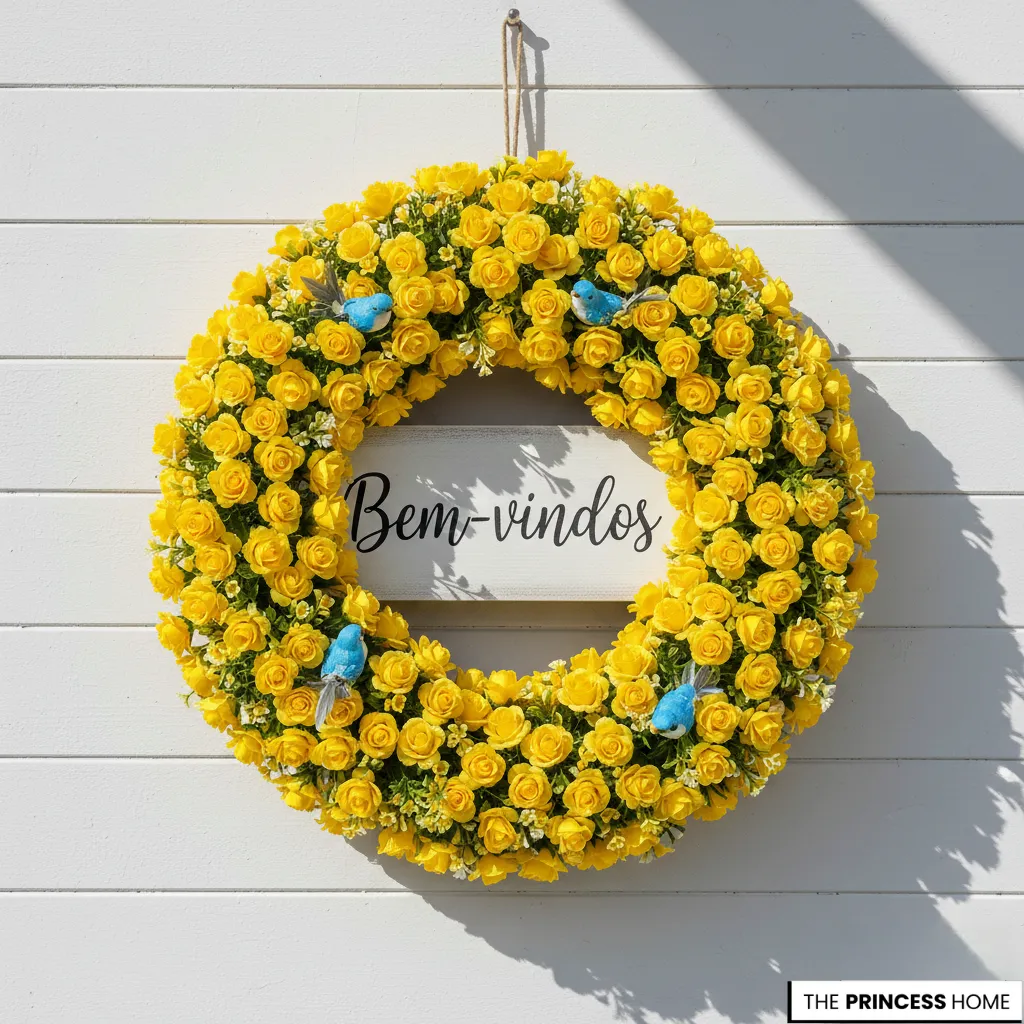 This full yellow rose wreath brings sunny, cheerful charm to any summer door. Mini yellow roses and greenery create a lush, vibrant look, while blue bird accents and a “Bem-vindos” sign add personalized charm. This easy DIY wreath offers a warm, welcoming greeting to guests.