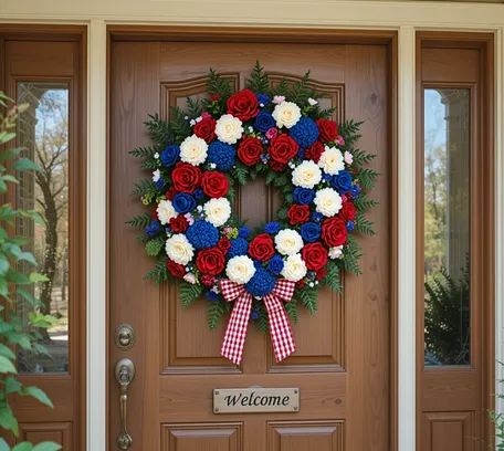 This vibrant and celebratory wreath is adorned with an array of red, white, and blue flowers, including roses, daisies, and delicate fillers. Blue and white plaid bows add a charming touch, making it ideal for holidays or a lively entrance display.