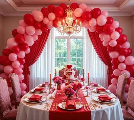 Red or pink tablecloths or runners can serve as a bold base, complemented by white dinnerware with red or pink accents for a classic and elegant look, while red or pink cloth napkins paired with rose-shaped napkin holders add a delightful touch. Heart-shaped red and pink balloons are a must-have, especially when paired with white balloons to balance the colors. Combine them into stunning balloon bouquets for an eye-catching and harmonious display.